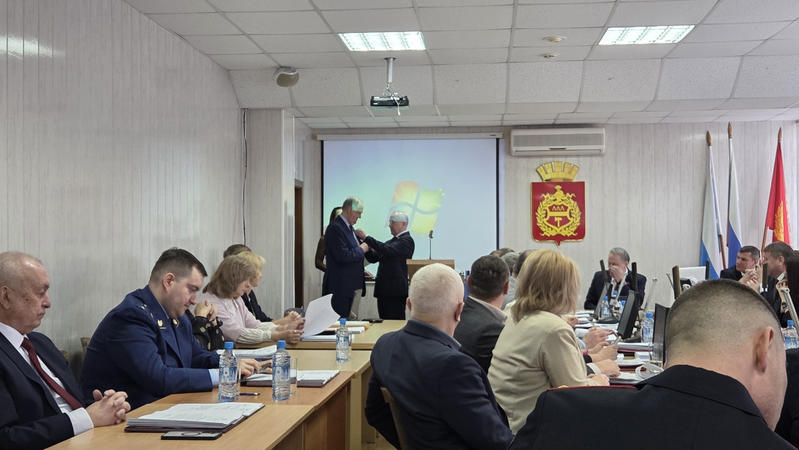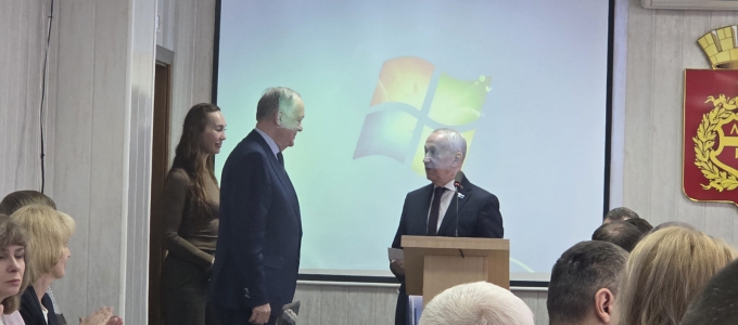На заседании Нижнетагильской городской Думы Вячеслав Погудин вручил Почётный знак «Серебряный знак Законодательного Собрания Свердловской области» одному из старейшин депутатского корпуса Нижнего Тагила Владимиру Антонову.