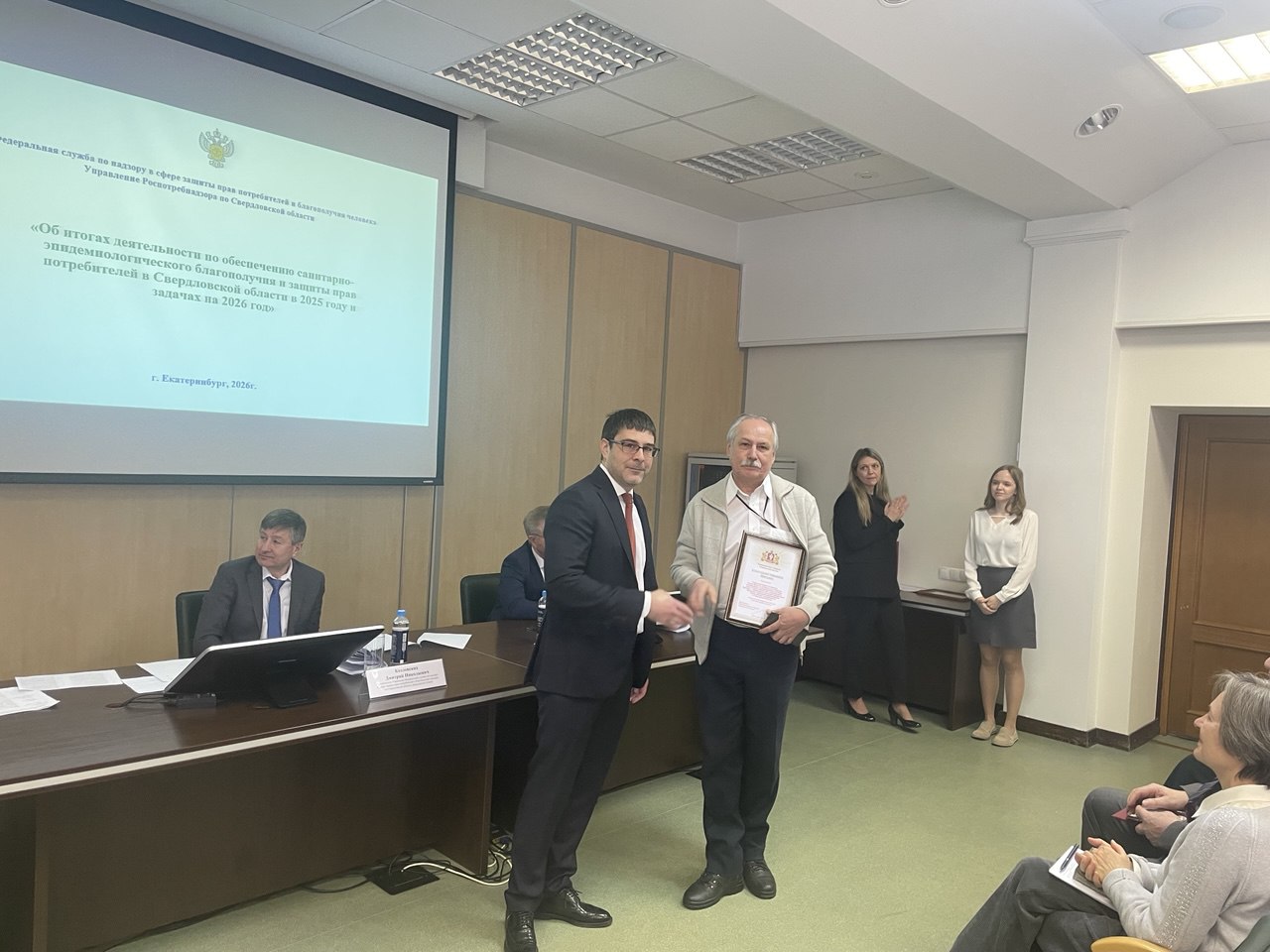 Леонид Хаютин принял участие в заседании коллегии «Об итогах деятельности Управления Федеральной службы по надзору в сфере защиты прав потребителей и благополучия человека и ФБУЗ «Центр гигиены и эпидемиологии в Свердловской области» в 2025 году. Задачи на 2026 год». Выступил с приветственным словом, а также по поручению Людмилы Бабушкиной вручил благодарственные письма Законодательного Собрания за многолетний добросовестный труд и высокий профессионализм специалистам Управления.